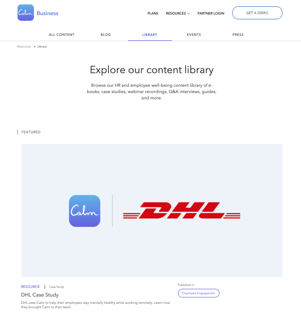 I drove the creation of the Calm Business Resource Hub from framework through to execution. We had a large library of external marketing collateral, but no where to house it—this resource center, which lives on the Calm Business website, includes the Calm Business blog, a library of resources (e-books, case studies, templates, guides, etc.), press mentions, and an events repository.