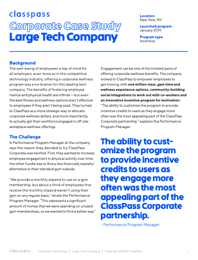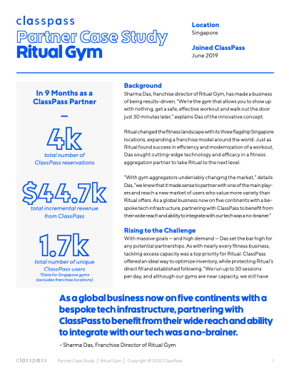 While at ClassPass I created more than a dozen case studies, detailing positive sentiments and success of global partners on the platform across all verticals — including fitness, wellness and corporate wellness.