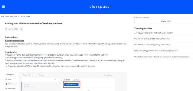 This Help Center article was created as ClassPass expanded livestream options for partners. As the driver for this post, I liaised between stakeholders in multiple departments across the company — from partnerships to product and legal.