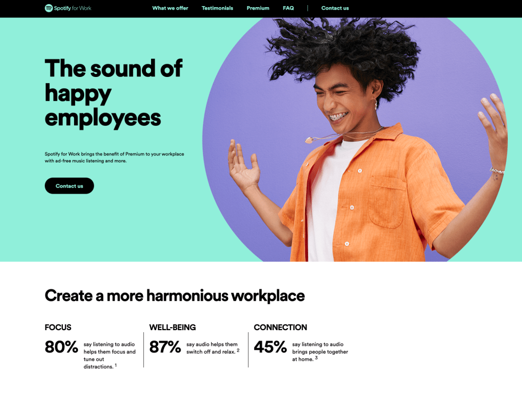 Drove copywriting and content strategy for newly-launched Spotify for Work offering from Spotify—Spotify’s entrance into the B2B employee benefits space. Worked alongside UX writers and proposition lead to craft value propositions, narrative, and overall creative direction.